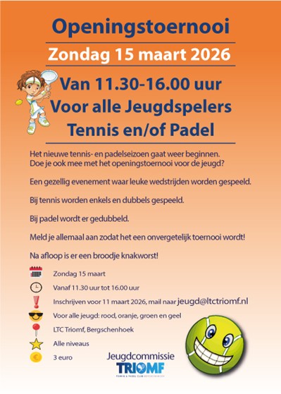 Het nieuwe seizoen gaat beginnen en zoals ieder jaar trappen we af met het Openingstoernooi. Jeugdleden kunnen zich inschrijven voor tennis of padel en op zondag 15 maart in poules tegen elkaar spelen. Voor tennis is dat mogelijk in enkel of dubbel, bij padel uiteraard alleen in dubbels. Alle niveaus zijn welkom en kosten zijn 3 euro per persoon. Inschrijven kan t/m 10 maart via jeugd@ltctriomf.nl.